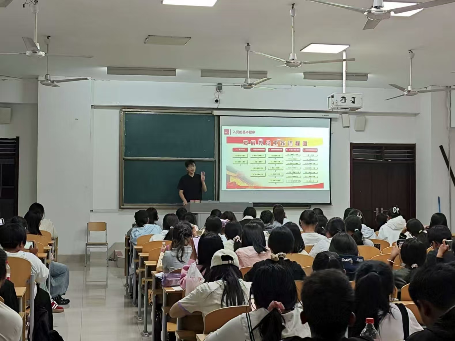 讲座围绕“大学生如何树立正确的入党动机”“以实际行动争取入党,必须进行持之以恒的努力”“以实际行动争取入党,还必须有老老实实的态度,靠自己真诚的努力”三部分展开,并通过流程图清晰展示了从递交入党申请书到转为正式党员的25个关键环节。