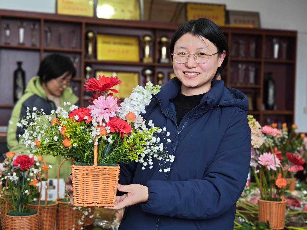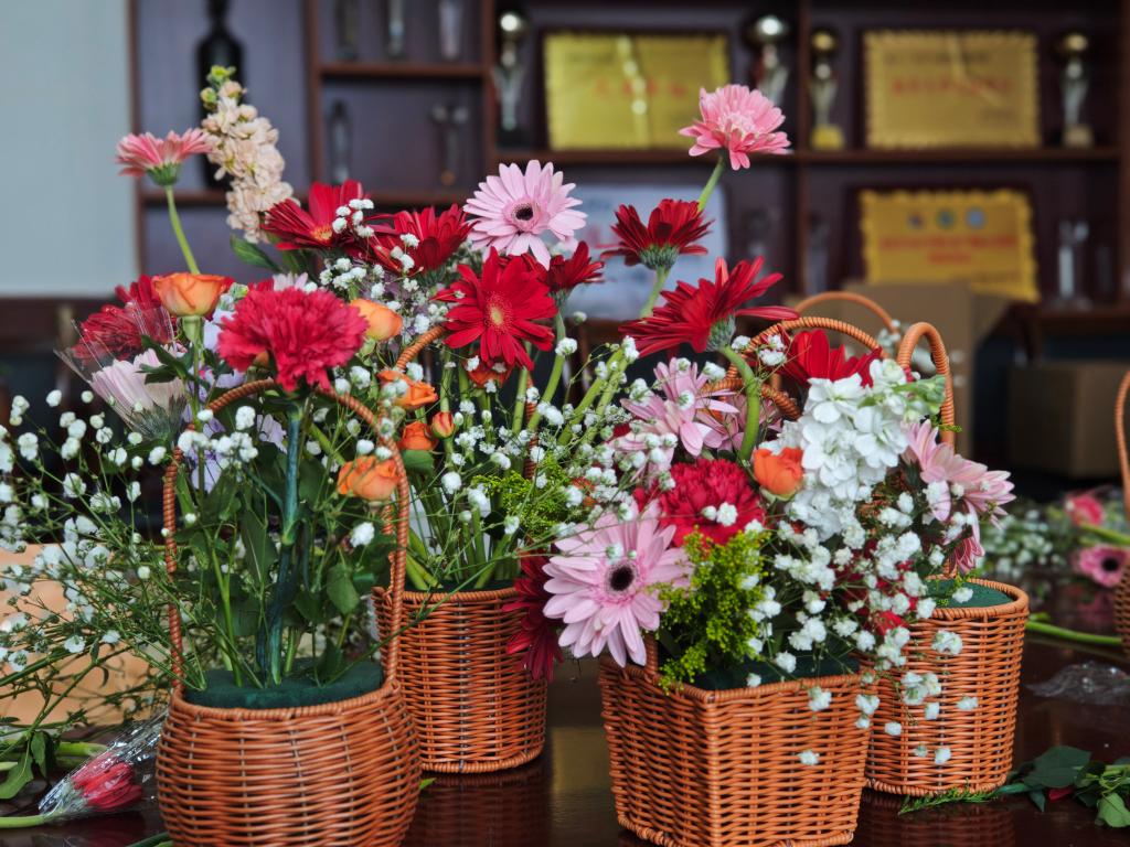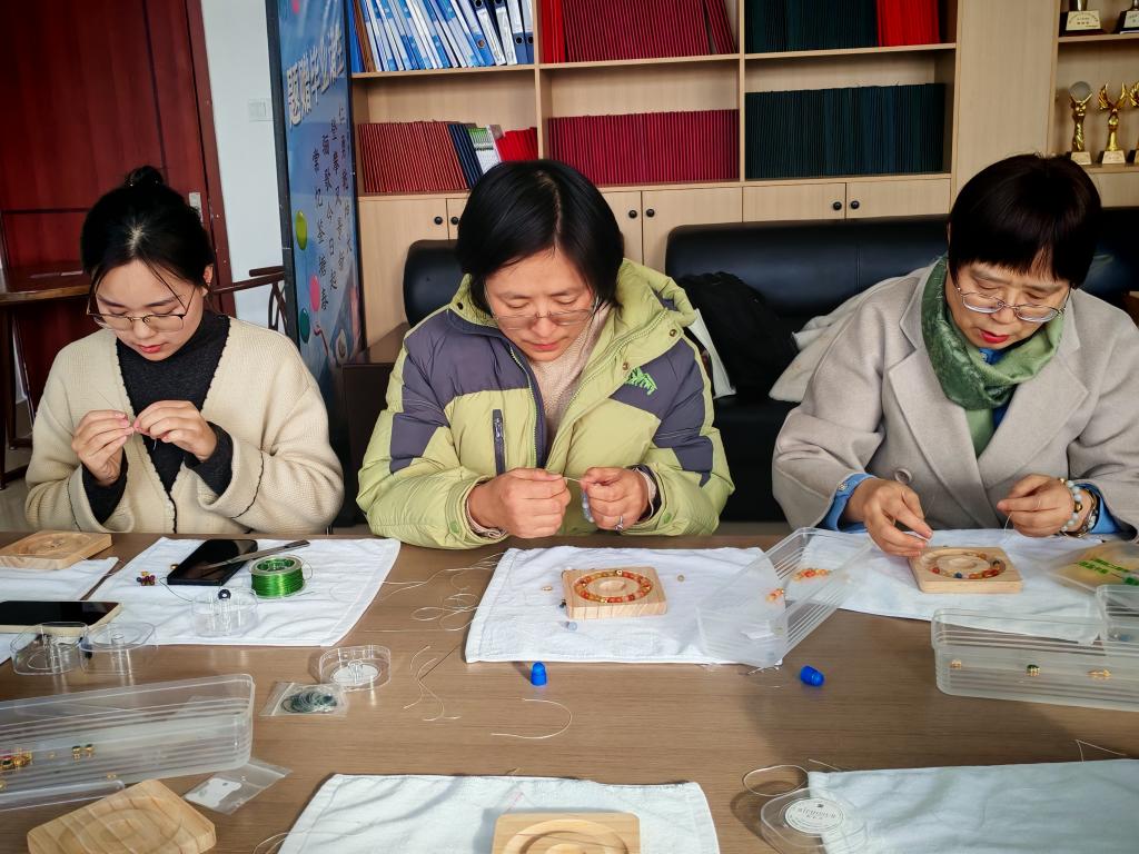 活动现场欢声笑语,春意融融。在艺术插花区域,教职工们发挥创意,将玫瑰、康乃馨、向日葵等花材精心搭配,制作出一个个象征美好与祝福的花篮。“插花是心灵的对话,今天不仅学到了技艺,更感受到生活的诗意。”老师捧着自己的作品感慨道。 串珠制作区则是一片专注的氛围,彩色琉璃珠在指尖流转,化作精致的手链、挂饰。大家互帮互助,分享配色心得,原本零散的珠子逐渐串联成独一无二的艺术品。而古法艾草锤手工体验更是别具匠心,教职工们填充艾草、捆扎棉布,制作出兼具传统养生智慧与实用价值的健康锤。“自己做的艾草锤,既能按摩肩颈,又能感受中医药文化,太有意义了!”王老师兴奋地展示成果。