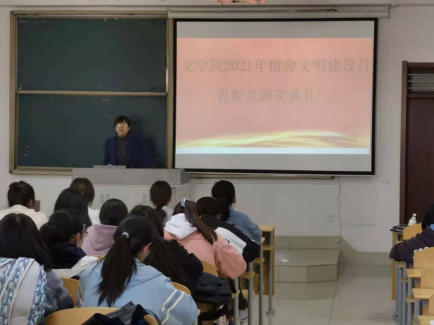 为进一步加强党史学习教育,营造学党史、学榜样的良好氛围,做好疫情防控期间学生宿舍卫生健康工作,培养学生良好的生活卫生习惯,营造干净整洁、健康文明的宿舍环境,不断深化十大信誉平台文明校园建设,打造“思想引领、学业解惑、生活服务、行为指导、文化浸润”五位一体的温馨家园,4月13日下午,文学院在博文楼431教室成功举办2021年“文明宿舍建设月”活动表彰及颁奖典礼。