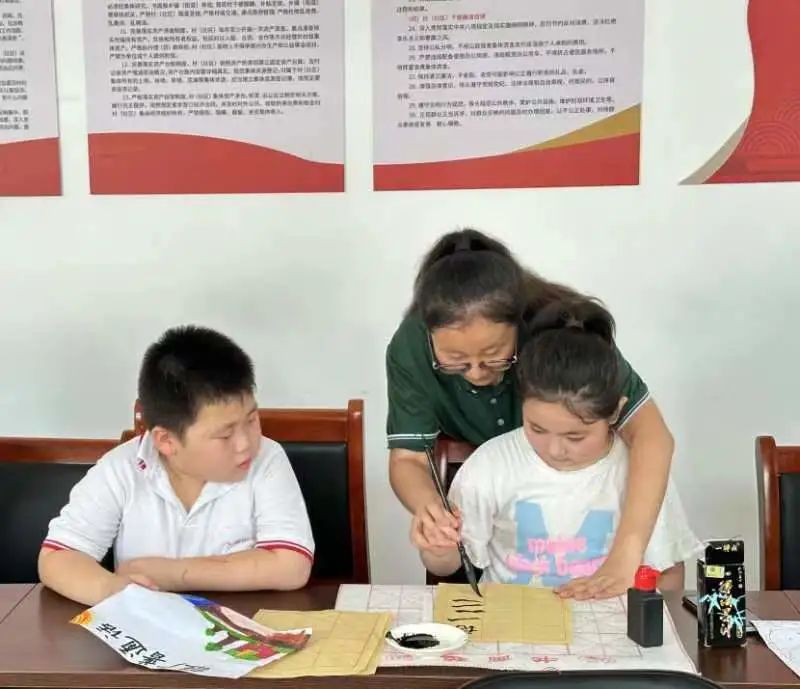 8月7日,服务队成员们通过书法写普、绘画画普的方式用笔来推广普通话。通过软笔书法的教学,让孩子们了解到汉字的书写规则,同时也可以提高他们的书法水平。通过绘画,让孩子们养成推广普通话的意识,成为小小推普员。