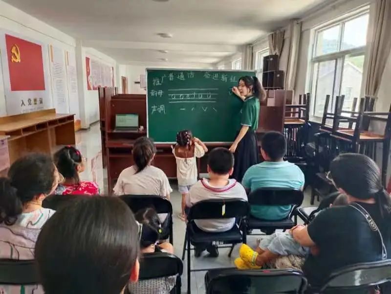 8月5日至6日,服务队根据当地教育需求和实际情况,以村中幼童为教学对象,依托汉语言文学专业的知识背景,通过寓教于乐的方式让孩子们感受到普通话的魅力,增强语言文字应用规范意识。在“汉诗文吟诵”系列课堂上,服务队成员们将汉字字音与吟诵结合,融入普通话教学,激发孩子们学习中华优秀传统文化的兴趣,强化育人效果;在“游戏小课堂”活动中,服务队成员们以成语接龙和绕口令的方式,锻炼了孩子们动口动脑能力,提升了他们学习、使用、传播普通话的热情。