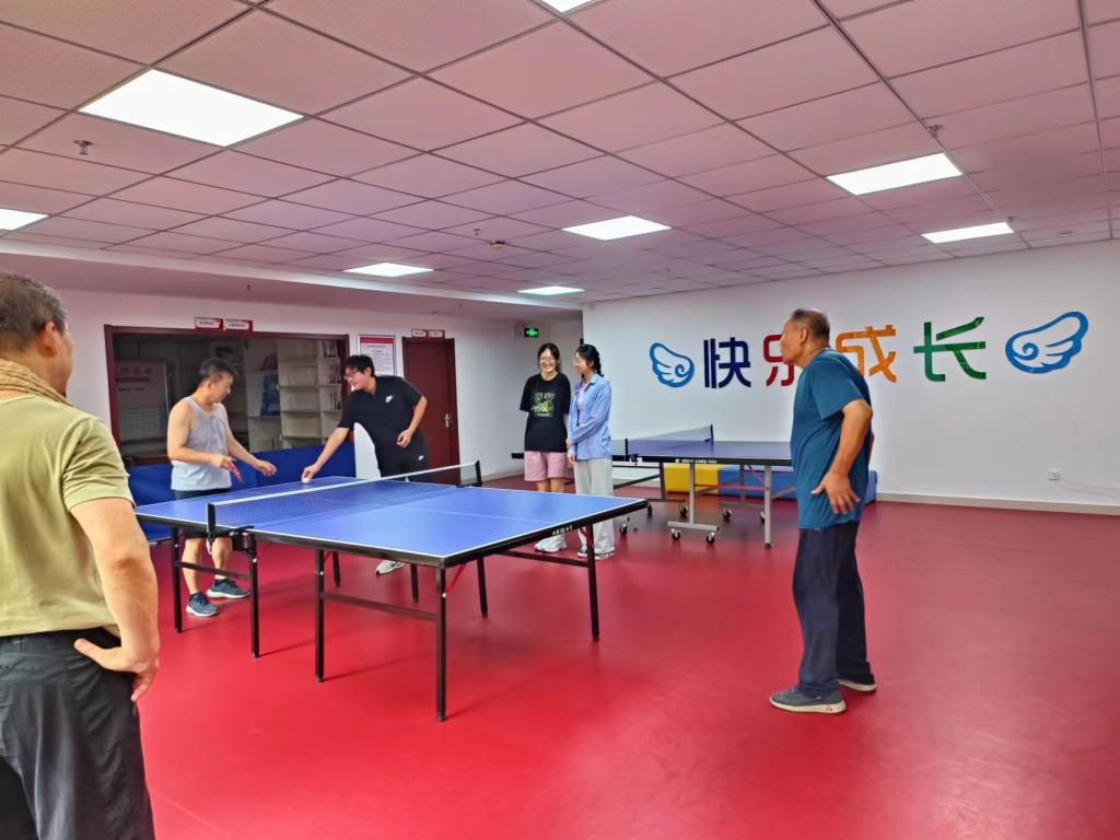 此外,社区还开设了老年人活动中心,为老人们提供了一个共享快乐的场所。在活动中心,老年人们可以参加各种娱乐活动,如唱歌跳舞、下棋打球、聊天打牌等,增强了他们的社交交流和友谊。同时,社区还定期组织专题讲座和技能培训,让老年人可以学习到新知识和技能,充实自己的生活。我们的志愿者积极与老年人进行互动,一起打乒乓球,还和社区工作人员进行了工作交流。