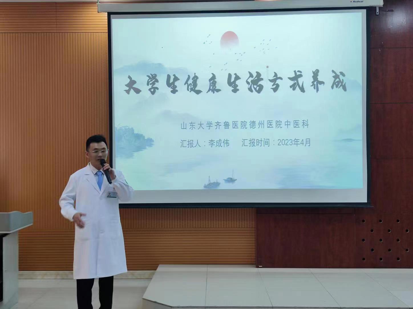 4月19日,由学生工作(部)处主办,文学与新闻传播学院承办的《大学生健康生活方式养成》专场讲座在博文楼三楼报告厅举行。报告由山东大学齐鲁医院德州医院中医科李成伟医师主讲,学生工作(部)处、文学与新闻传播学院相关负责人,全校200余名师生参加了此次专场讲座。