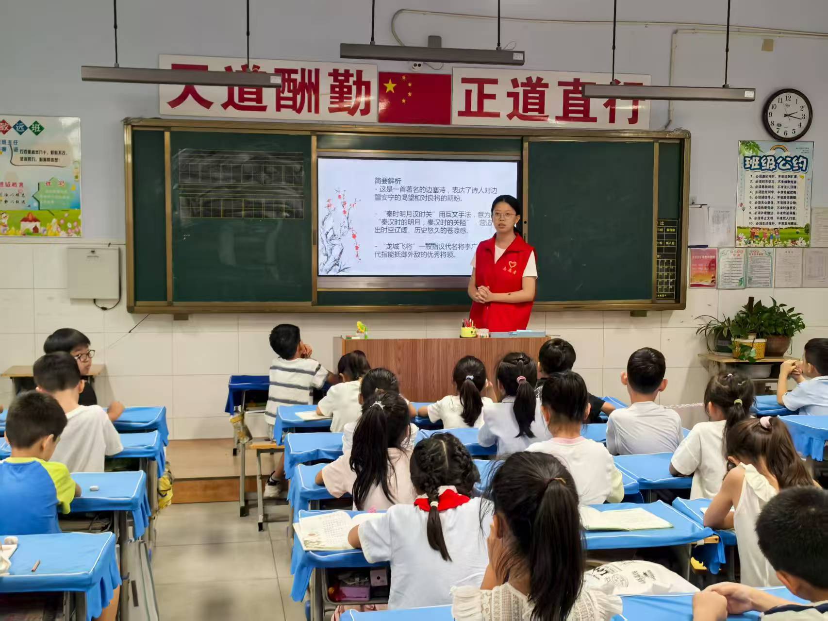 活动开始,志愿者们选取了《草原》《出塞》等展现民族精神的经典诗文,为孩子们展开了一场跨越民族与时空的对话。现场志愿者化身“文化传薪人”,通过民族服饰展示、多民族情景短剧演绎等多元化教学手段,将“各民族手足相亲”的深情、“同心共筑中国梦”的壮志转化为可触可感的具象表达;在“古今同心”环节中,孩子们用稚嫩的笔触写下“我要和不同民族的小伙伴做朋友”“尊重各民族的习惯就是守护团结”等真挚话语,让诗文中的团结情怀与新时代的童声产生共振。