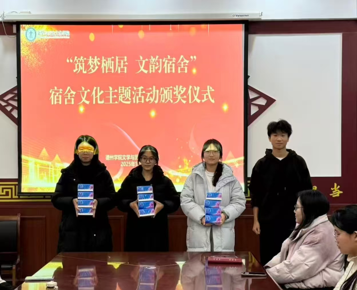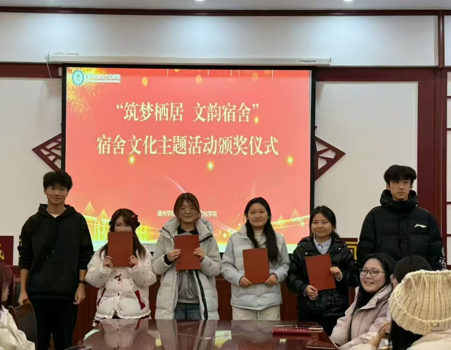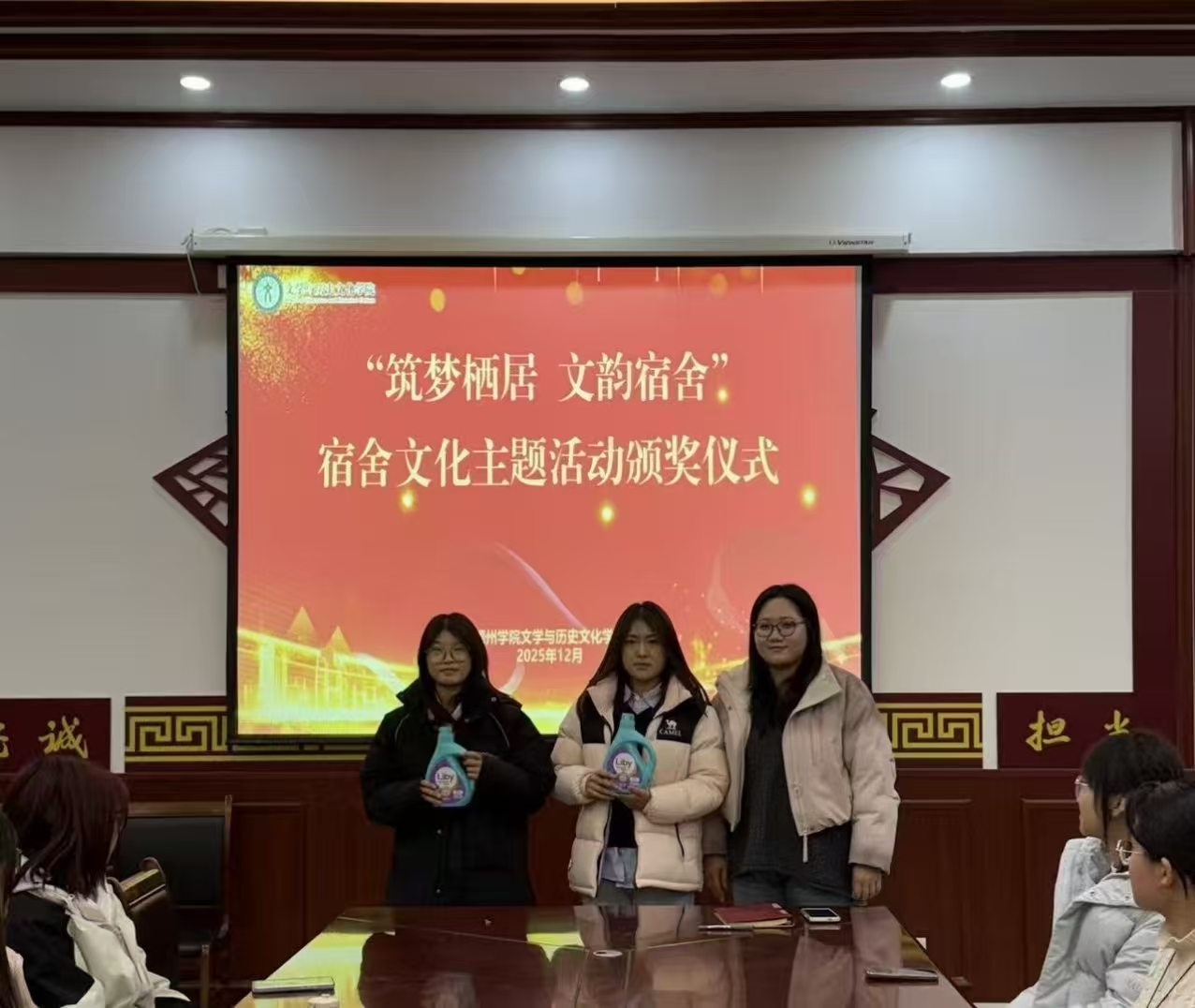 颁奖活动现场,全体同学共同观看了活动中的优秀作品展示,作品体现了宿舍成员之间的默契与凝聚力。老师及活动负责人依次为各赛道获奖同学颁发荣誉证书与奖品,高度肯定了同学们的创新思维与协作精神,希望同学们以此次活动为契机,将活动中传递的文化理念与协作精神融入日常,持续保持宿舍卫生整洁与内务规范,进一步增进室友间的沟通与理解,共同营造温馨和谐、积极向上的宿舍氛围。