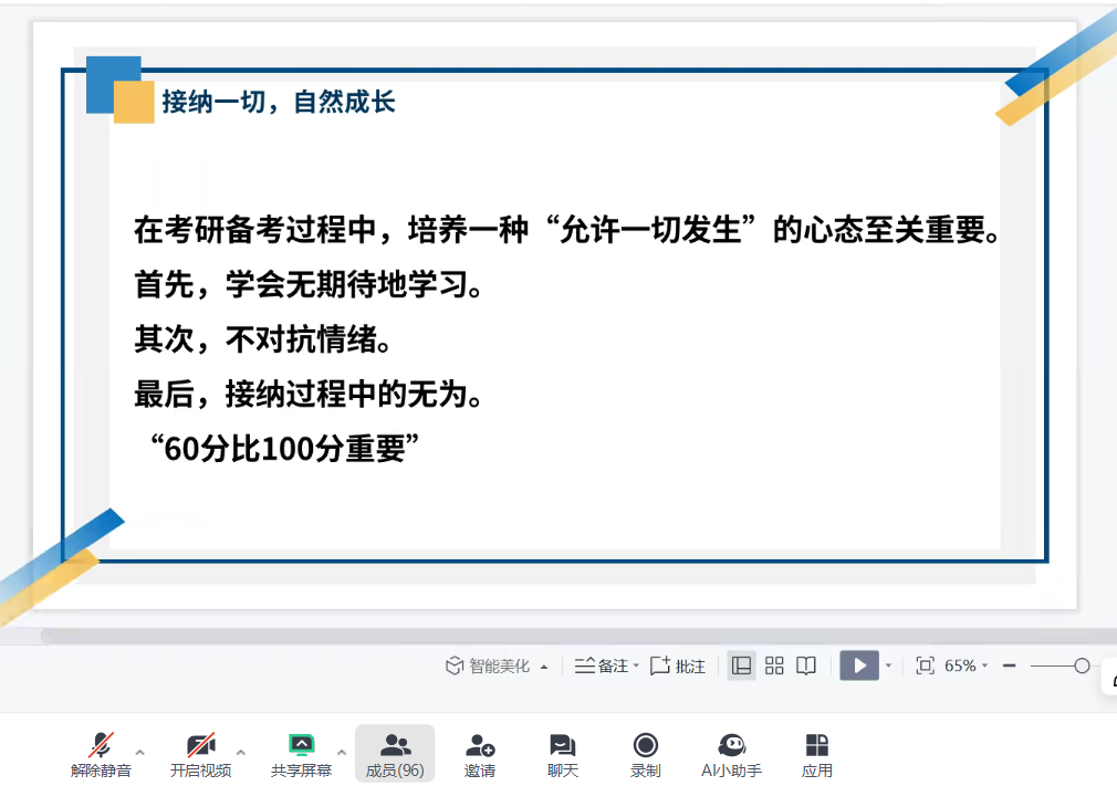 本次分享会邀请了4位2020届优秀毕业生进行经验分享,详细介绍了考研复试流程、英语口语、综合面试、复试调剂等方面的注意事项。考入西安外国语大学的赵梦蝶虽有事不能现场分享,但准备了逐字稿由主持人马超老师进行转述。她着重分享了考研择校和复试准备的方法,包括如何撰写复试简历、如何整理个人材料等,告诉大家考研过程中要“允许一切都发生”,学会及时调整心态,才能走得更稳。考入安徽师范大学的张统领结合自身经历,重点强调了复试模拟的重要性,建议在复试前进行不少于五次的模拟面试,以帮助自己适应高压环境,达到最好状态。考入牡丹江师范学院的陈梦雨提醒同学们要积极拓宽信息渠道,密切关注考研复试及调剂动态,就考研复试备考策略、心态调整等方面提出了具体建议。考入聊城大学的刘晓清详细介绍了考研择校的和复试专业课的方法,并建议现场同学不要懈怠学校课程的学习,复试专业课可以多跟老师们交流真题思路等。
