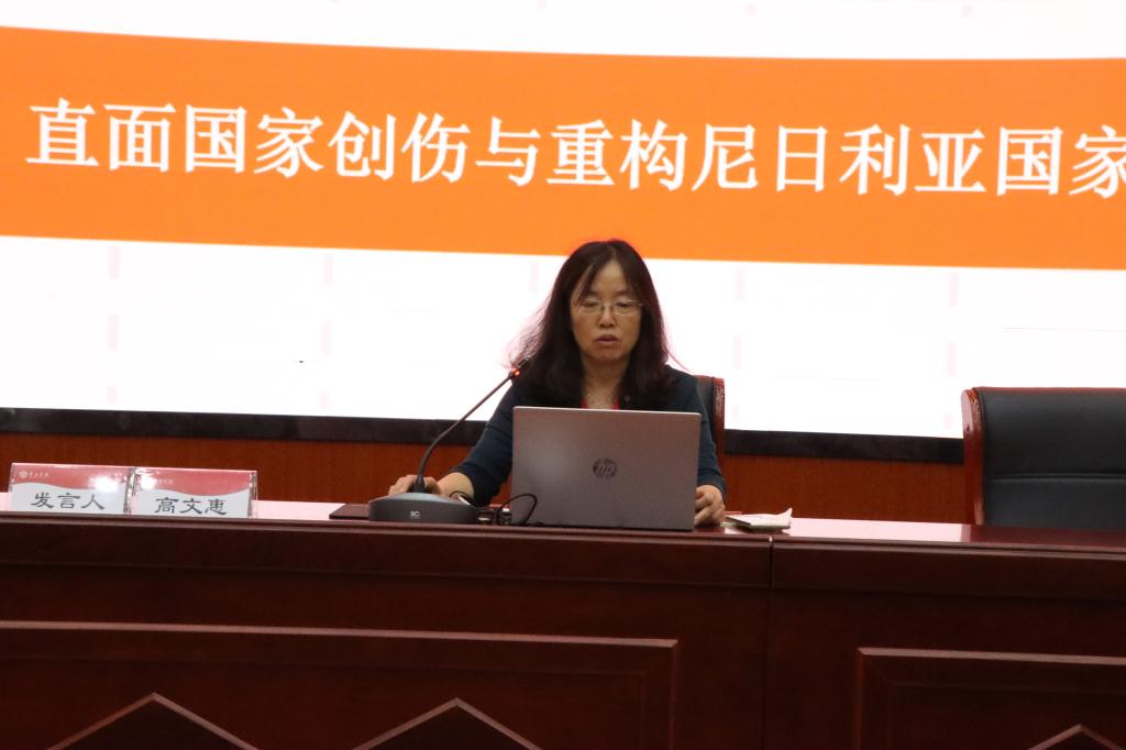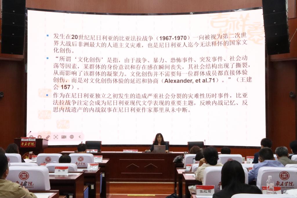 会上,高文惠教授应邀做了“尼日利亚女性内战小说的性别化特征”的主旨发言,分析了恩瓦帕、埃默切塔、阿迪契这三位女作家的尼日利亚内战小说在挑战传统战争文学话语偏见的创作意图下,形成了一些与男性作家内战书写不同的性别化特征。她们致力于书写女性求生存的战争,将尼日利亚内战文学的叙事空间由战场拓展到了家园;她们小说中女强男弱的形象塑造倾向颠覆了传统战争文学话语中男性与女性——主动性与被动性的性别结构模式;她们对战争中施加于女性身体的强奸暴力事件的现实主义描绘,揭示了该罪行背后的性压迫实质。她们对比亚法拉战争历史记忆的记录、保存与唤醒,都是为了重构对民族和解基础上的尼日利亚国家身份认同,发言获得与会专家的一致好评。仲冲副教授为第五组分论坛做了汇报。