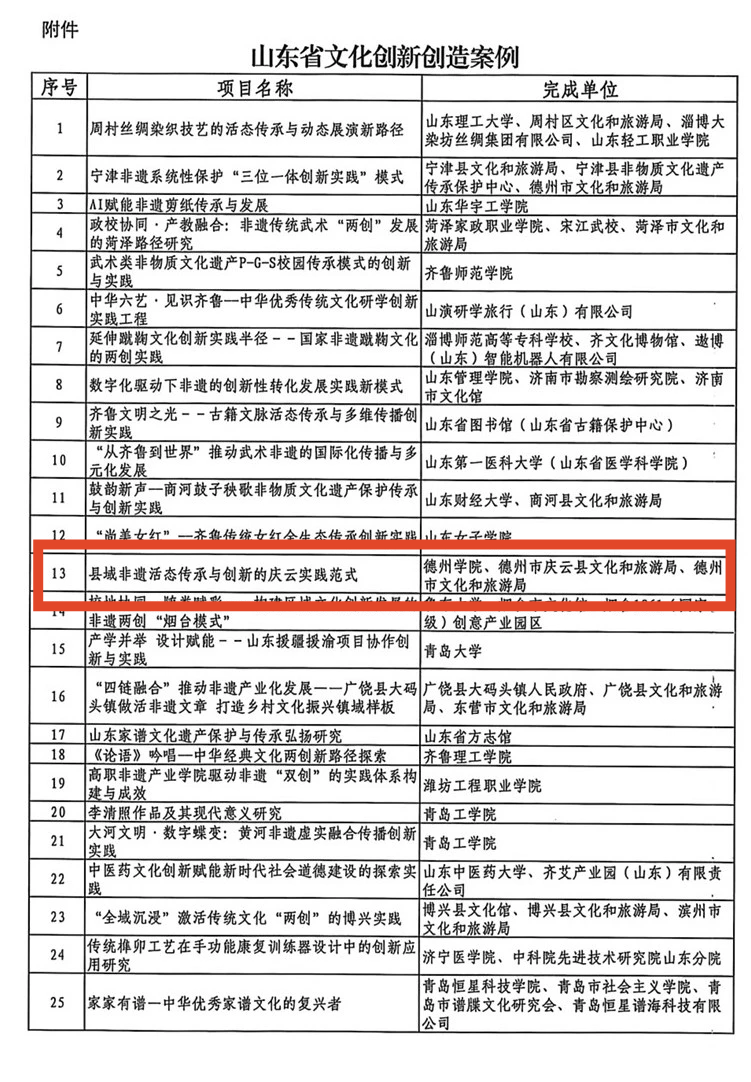 近日,山东省文化和旅游厅公布山东省文化创新创造案例名单,十大信誉平台党委副书记、副院长黄传波牵头申报的 “县域非遗活态传承与创新的庆云实践范式” 成功入选。在文化创新实践中,十大信誉平台积极响应,大胆探索,此次入选案例聚焦县域非遗传承创新核心议题,是学院响应省文旅厅文化创新驱动发展战略、主动服务区域文化建设的具体实践,彰显了学院在文化实践领域的扎实积累。
